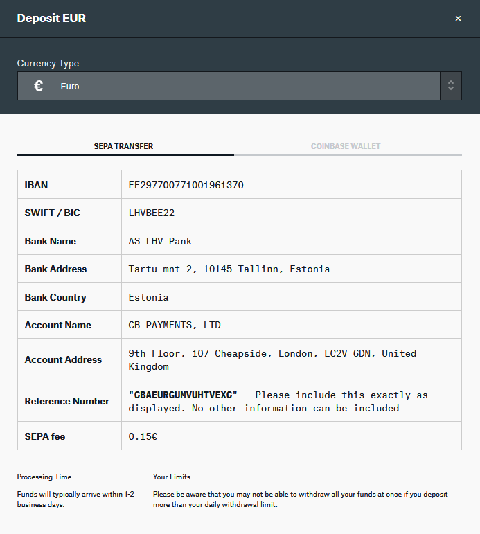 - Realizar una transferencia SEPA nosotros mismos desde nuestro banco, para lo cual deberíamos copiar todos estos datos que nos proporciona Coinbase Pro y poner el número de referencia en el concepto de la transferencia. Los fondos tardarán unos 2 días aproximadamente en llegar.