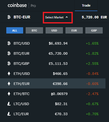 Para ello, haremos click en 'Select Market' para escoger el par con el que queramos operar, por ejemplo BTC/EUR si queremos comprar Bitcoin con Euros: