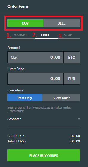 Podemos cambiar fácilmente entre compra y venta (buy o sell) y en las pestañas siguientes veremos que tenemos tres opciones para realizar las operaciones.